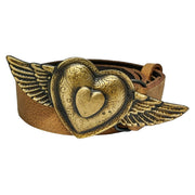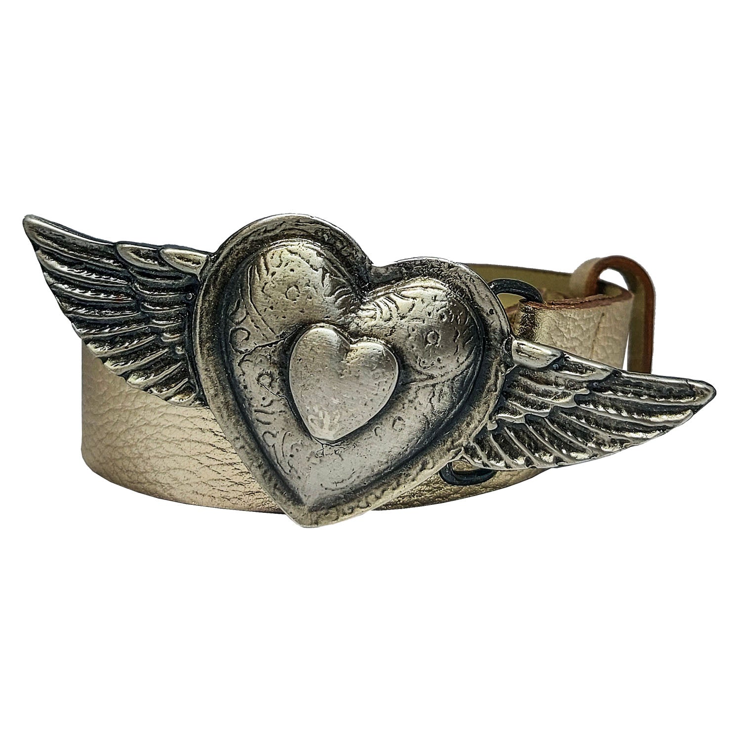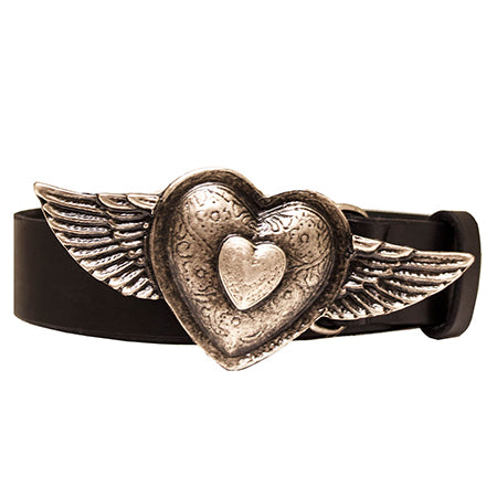 Cinturón de cuero con hebilla con forma de corazón con alas, el complemento perfecto para tus outfit. Mide 3,5 cm de ancho, y tiene 5 hoyitos para ajustar a la cintura.