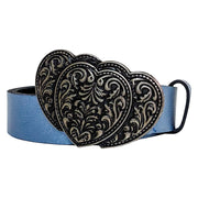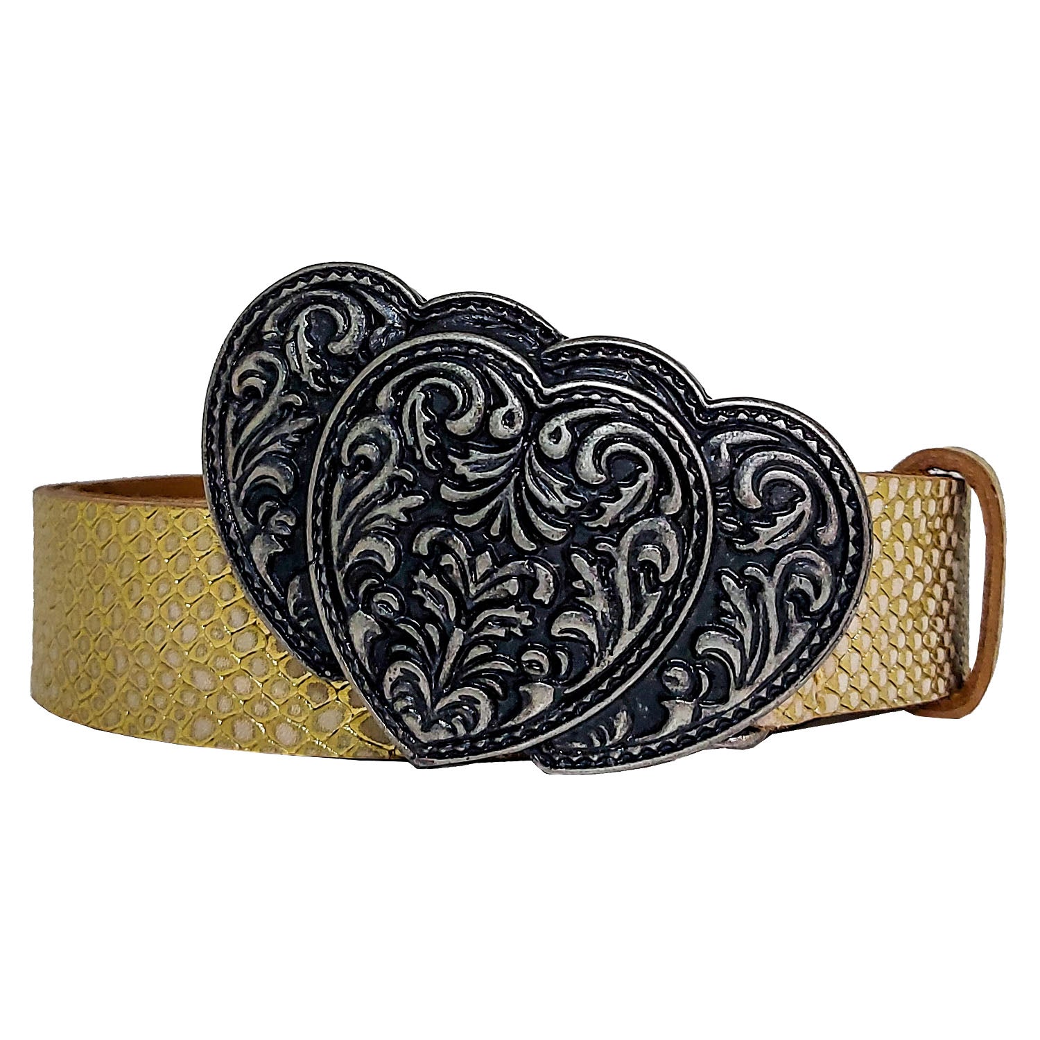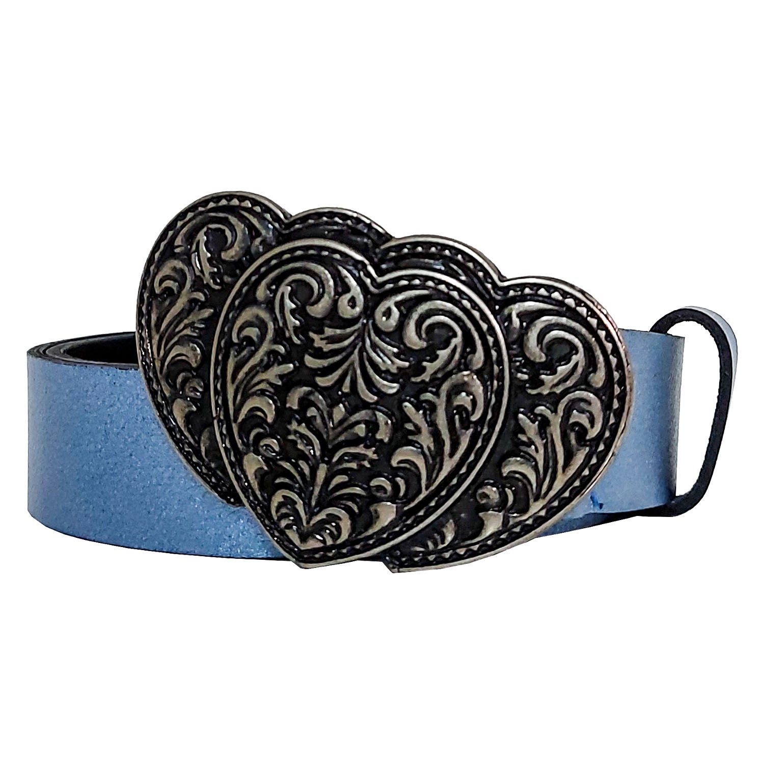 Cinturón de cuero con hebilla con forma de 3 corazones, perfecto para darle un toque diferente a todos tus outfit! Mide 3,3 cm de ancho, y tiene 5 hoyitos para ajustarlo.